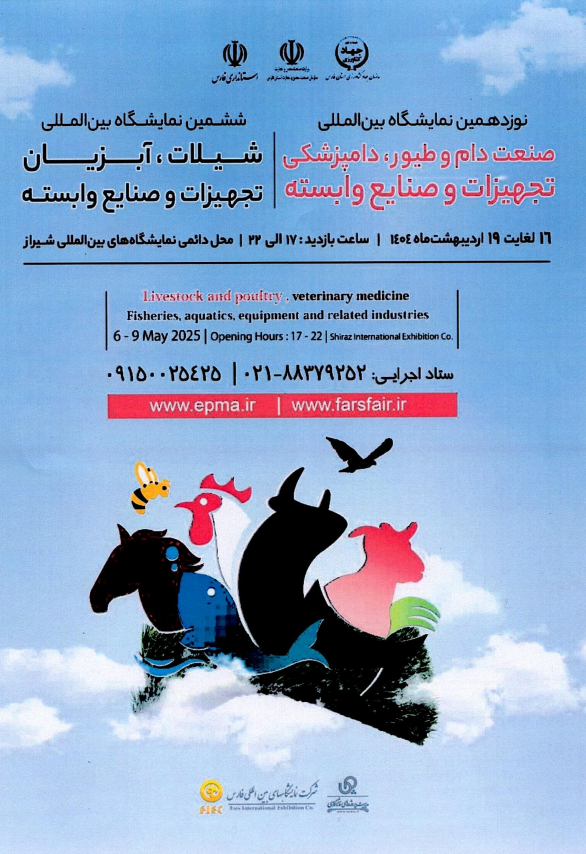 نوزدهمین نمایشگاه بین المللی صنعت دام و طیور، دامپزشکی و تجهیزات و صنایع وابسته و ششمین نمایشگاه بین المللی شیلات، آبزیان و تجهیزات و صنایع وابسته از 16 تا 19 اردیبهشت 1404 (6 تا 9 می 2025) در محل دائمی نمایشگاه‌های بین المللی شیراز برگزار می‌شود. علاقمندان جهت مشارکت و کسب اطلاعات بیشتر می‌توانند به آدرس اینترنتی www.epma.ir و www.farsfair.ir مراجعه نمایند.